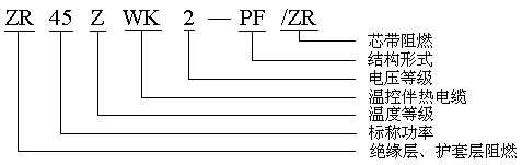 例如:35ZWK2-J  即:中溫基本型,10℃時每米輸出功率35W,工作電壓220V。      ZR45ZWK3-PF  即:阻燃中溫屏蔽防護型,10℃時每米輸出功率45W,工作電壓380V,具有阻燃、防爆、防護性能。二 技術指標:   1、溫度范圍:               ***高工作溫度105±5℃;               ***高表面溫度135℃;               ***高承受溫度:改良性聚烯烴105℃、阻燃聚烯烴135℃、含氟聚烯烴180℃、全氟材料205℃   2、施工溫度:***低-40℃,***佳施工溫度為0℃以上   3、熱穩定性:通斷各1000次,連續30天,電纜發熱量維持在90%以上。   4、彎曲半徑:20℃室溫時為12.7mm    -30℃低溫時為35.0mm   5、絕緣阻:電纜長度100m,室溫20℃時用1000VDC在屏蔽層與導電線芯之間搖試1分鐘,絕緣電阻***小值為1200MΩ。   6、工作電壓指12、24、36、48、110、220、380伏特等,交直流兩用,低電壓產品不得在高電壓條件下應用。